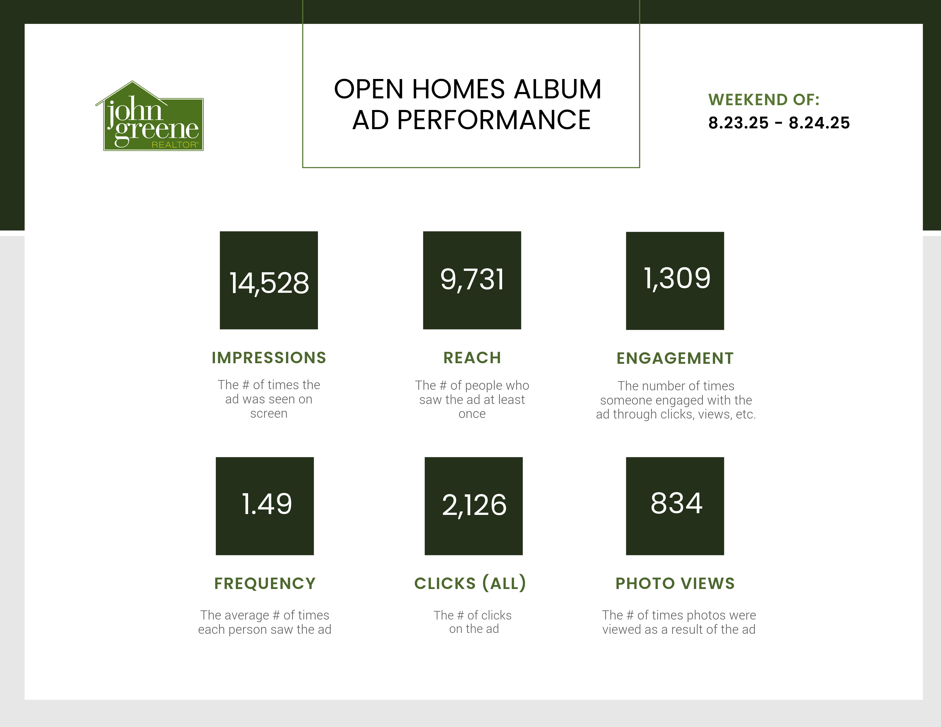 Weekend Open Home Advertising: To drive maximum awareness and generate high-quality foot traffic for the weekend open house at 593 Spring Leaf Drive through a targeted digital advertising campaign.