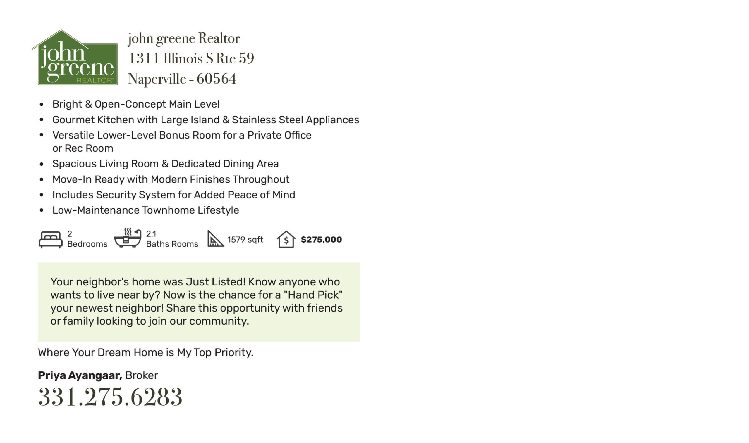 Hyper-Local "Just Listed" Campaign: Simultaneously, I launched a print marketing campaign, mailing beautifully designed postcards to the surrounding neighborhood. This strategy is about more than just finding a buyer; it’s about empowering the community to "hand-pick" their next neighbor, often uncovering buyers who want to live near friends or family.
